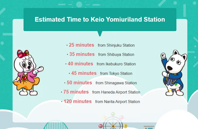 Pokémon Park is located within Yomiuriland in Tokyo. It takes about 25 minutes from Shinjuku, 75 minutes from Haneda Airport, and 120 minutes from Narita Airport to reach Keio Yomiuriland Station. From there, you can take the Sky Shuttle aerial tram for about 5–10 minutes to arrive at the park.