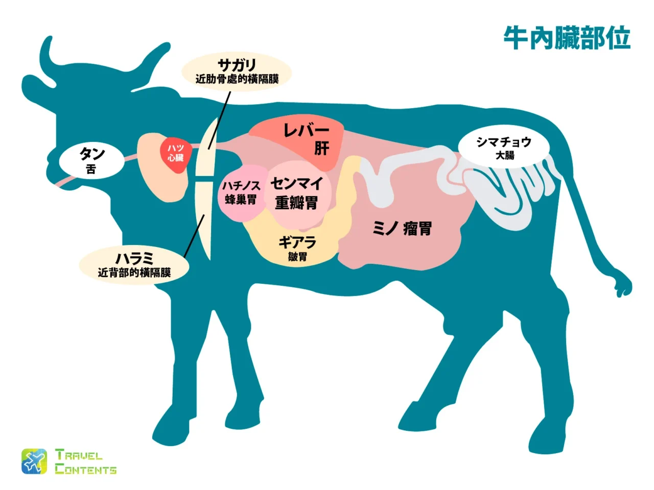| ミノ(mino) | Blanket tripe | 瘤胃,牛的第一胃,也是四個胃中最大的胃袋。 | 厚實有彈性,脆脆的口感,越嚼越香。 |