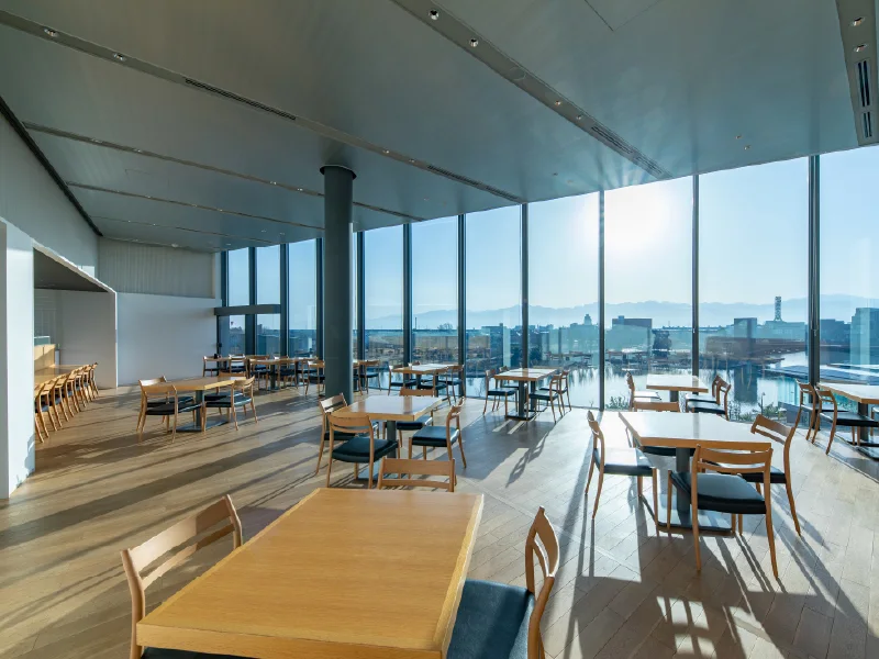 富岩運河環水公園に面した大きな窓からは、公園の景色をお楽しみいただけます。晴れた日には、立山連峰の絶景も!