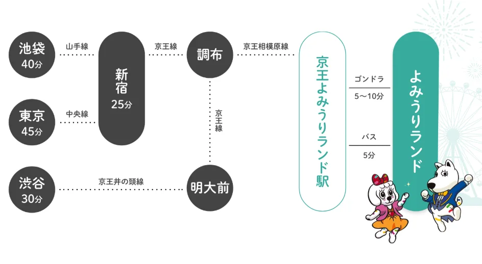 ポケパーク カントーは東京・よみうりランド内にあり、新宿から約25分、羽田空港から約75分、成田空港から約120分で「京王よみうりランド駅」に到着できます。そこから空中ケーブルカー「スカイシャトル」に乗り換え、約5~10分でパークに到着!