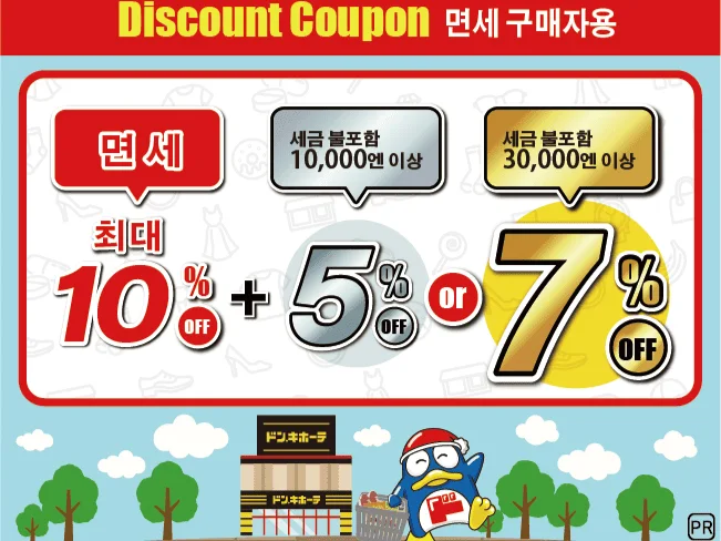 돈키호테(Donki) 전 일본 지점은 결제 시 10% 면세+최대 7% 할인 혜택을 제공합니다.