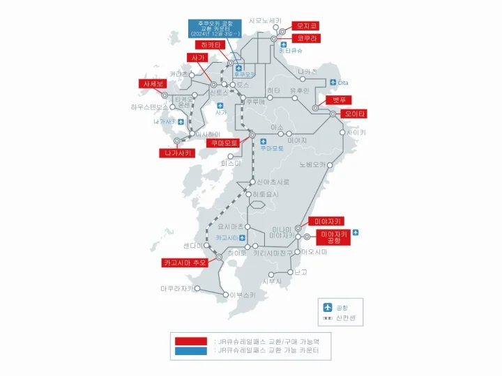 규슈로 직행하는 경우는 모든 규슈 지역을 커버하는 JR 규슈레일패스의 이용을 추천합니다. 3일간, 5일간, 7일간 플랜이 있으며, 여행 일정에 맞추어 최적의 기간을 선택할 수 있습니다. 부분적으로 규슈를 관광하는 경우는 북큐슈랑남큐슈 패스도 참고해 보세요.