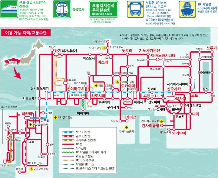 이 교통 티켓을 사용하면 간사이에서 오카야마·히로시마·야마구치·돗토리·시마네 등의 지역을 경유해 규슈 지역(후쿠오카·사가·나가사키·구마모토·오이타) 내에서는 7일간 무제한으로 이용할 수 있습니다.