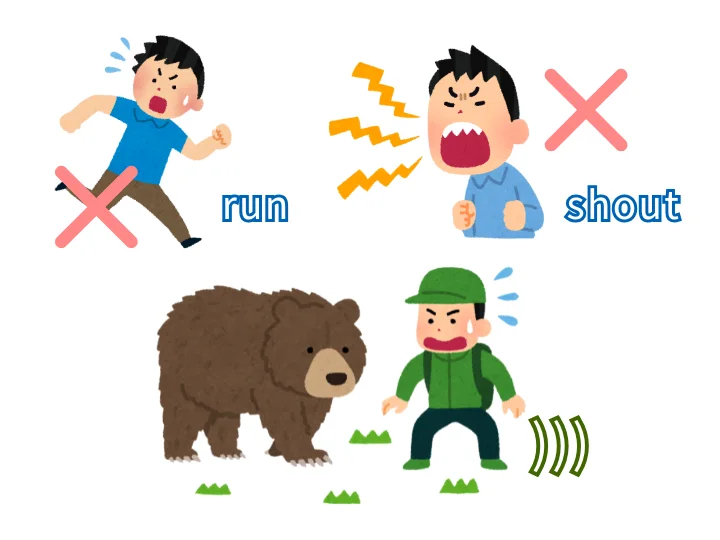 ❌달리며 도망가기 ❌큰 소리로 외치기 ❌나무에 오르기 ❌넘어져 죽은 척하기 등 이것들은 모두 잘못된 행동입니다. 곰을 만나게 되면 침착하게 곰 쪽을 향하고 천천히 뒤로 물러나면서 거리를 조금씩 벌리세요.