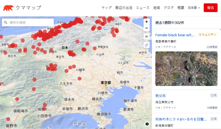 일본에서는 이미 곰의 출몰 정보를 정리한 ’쿠마 맵 (Kumamap)’ 지도가 공개되어 있습니다. 이 지도는 일본어와 영어를 모두 지원하며, 2D와 3D 모드를 전환하여 사용할 수 있습니다. 일본 전국의 곰 출몰 정보를 통합하고 있어서 이용자는 각 지역의 곰 피해 상황을 보다 신속하고 직관적으로 파악할 수 있습니다.
