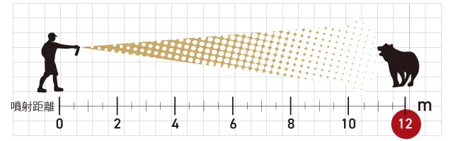 일반적인 곰 스프레이의 유효 사거리는 약 5~10 미터로, 강화판 제품이라면 최대 12 미터까지 발사되는 것도 있습니다.