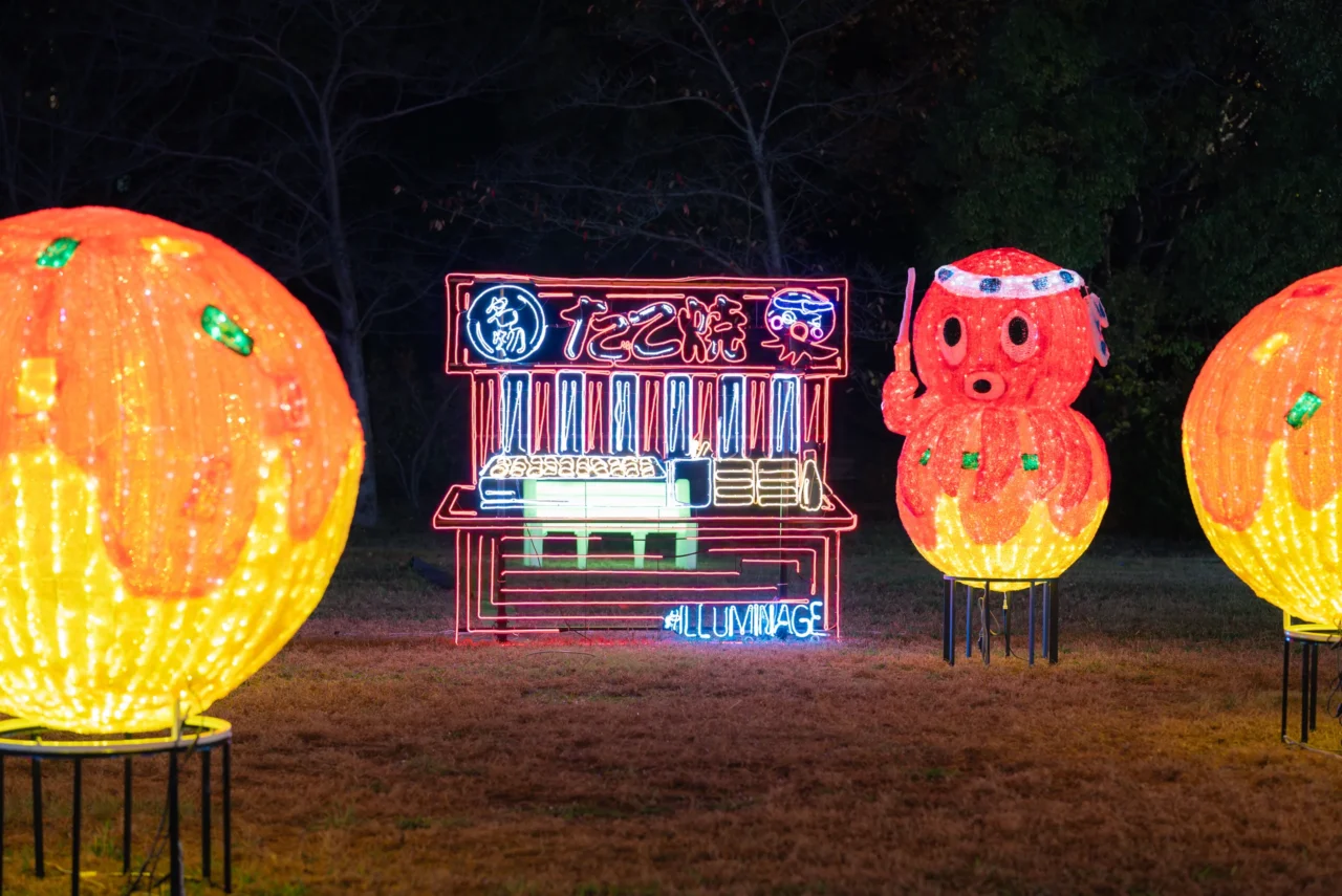 今年大阪城的點燈主題為「豐臣之夢・天下統一」,重現六位武將的華麗盔甲燈飾,感受濃厚歷史氛圍。同時推出「大阪觀光地系列」燈區,包含通天閣、道頓堀、神社與章魚燒造型燈飾,打造最具大阪特色的夢幻光景。