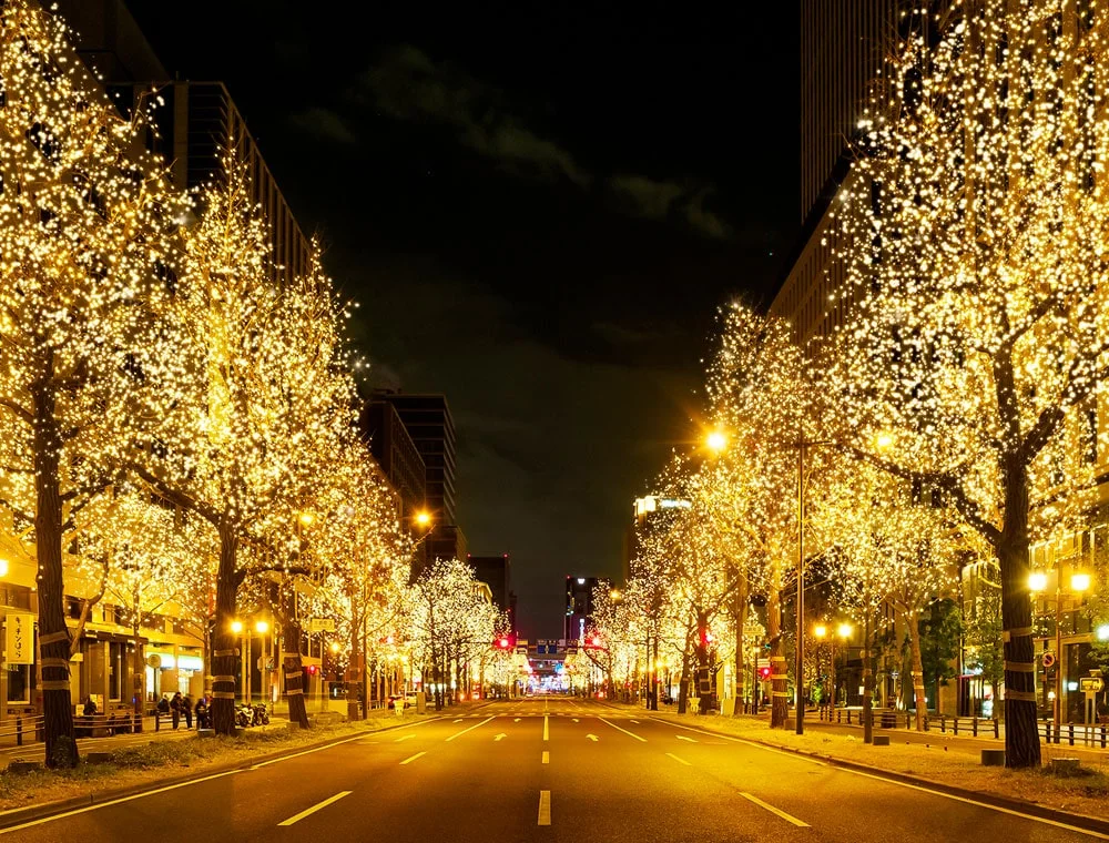 從梅田阪神前一路延伸至難波西口,全長約4公里的御堂筋化身夢幻光之大道!不論是開車穿梭其中,或漫步在閃耀燈海下,都能感受到滿滿聖誕氛圍。此外,12/14~12/25於中之島還會舉辦聖誕市集,販售雜貨、飾品與美食,氣氛超熱鬧!