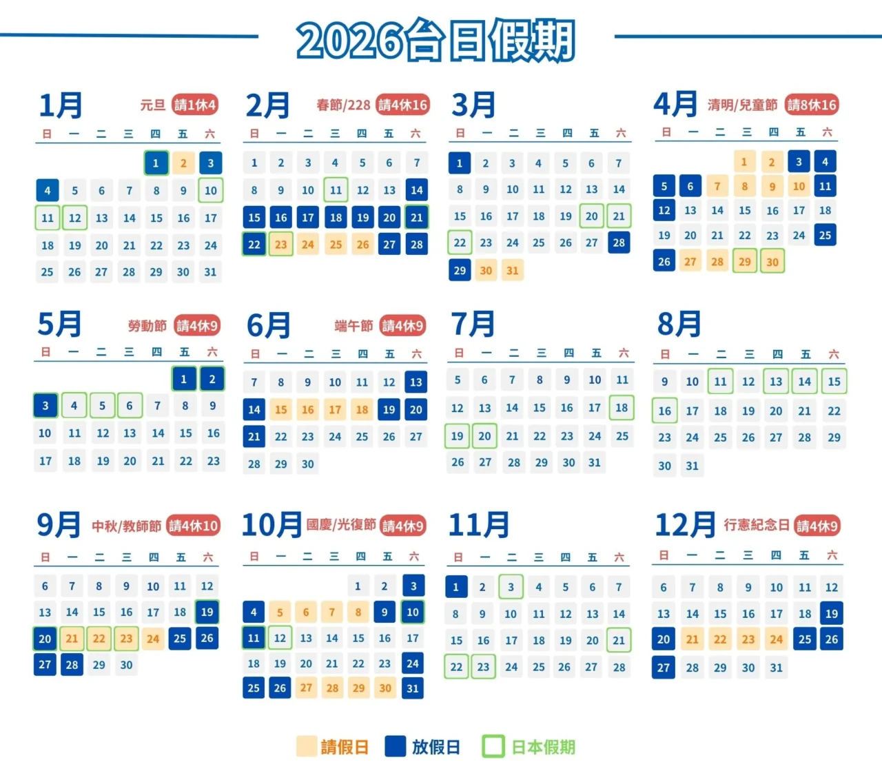 - 2 月:春節+228:請 4 休 16(全年最強連假)