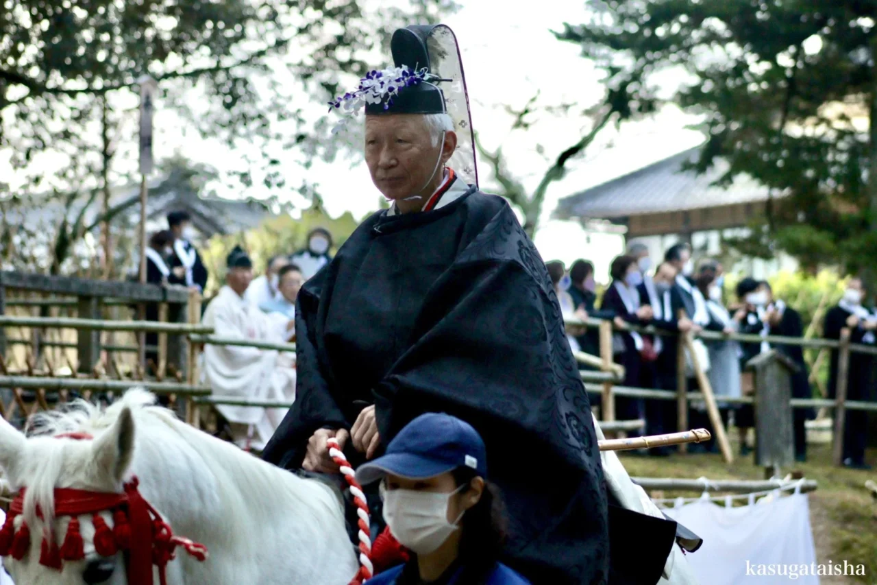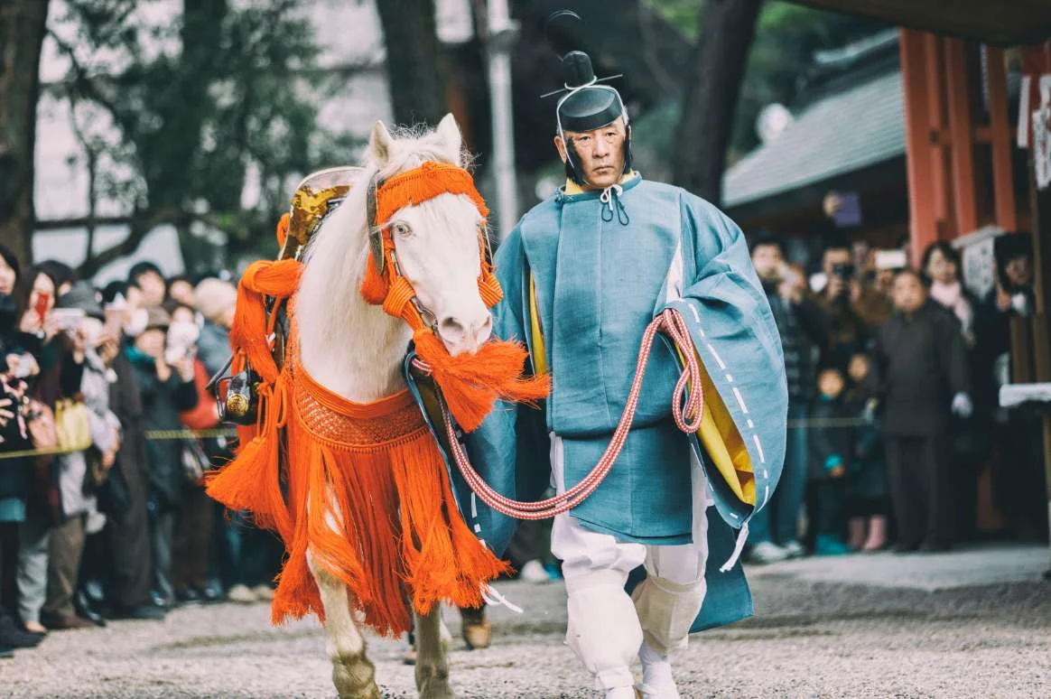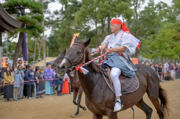 歷史悠久的古老神社,以馬相關神事聞名。每年十二月舉行的「春日若宮御祭」,有神輿渡御與行列中的馬,氣勢雄壯。「競馬」神事讓馬在神前奔跑競速,象徵五穀豐收與馬為神使。新年則有「白馬神事」,皆展現馬與祭典的深厚連結。