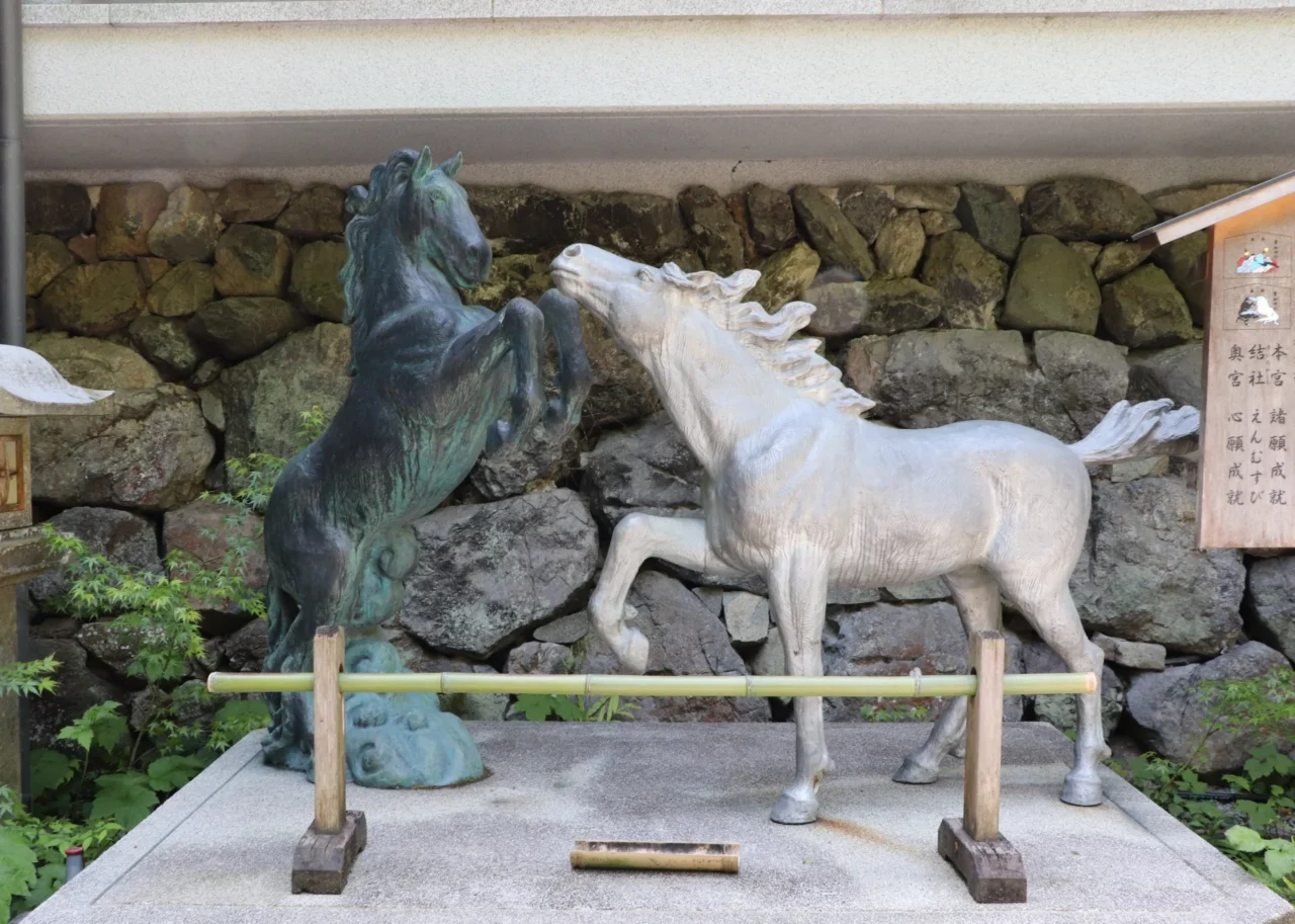 供奉水神的古老神社,與馬淵源深厚。古時祈雨獻黑馬、祈晴獻白馬,後改以畫馬木板取代活馬,被視為繪馬文化的起源(繪馬的起源神社)。神社內設有神馬像,至今仍有參拜者奉納繪馬,祈求交通安全與勝負運。