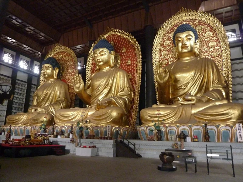 ● 中央安置释迦如来像,左侧为阿弥陀如来像,右侧为手持药壶的 药师如来像。