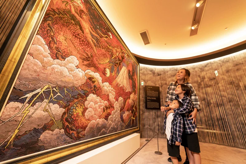 馆内提供世界首创的沉浸式3D影像体验,让您彷佛进入画作之中,还有以古典壁画技法「affresco」与混合技法「mixed media」创作的绘画和凋塑。此外,还设有充满创意的工作坊、艺术工作室空间,以及咖啡厅等设施,让来自世界各地的游客都能彻底体验绢谷幸二的艺术世界。