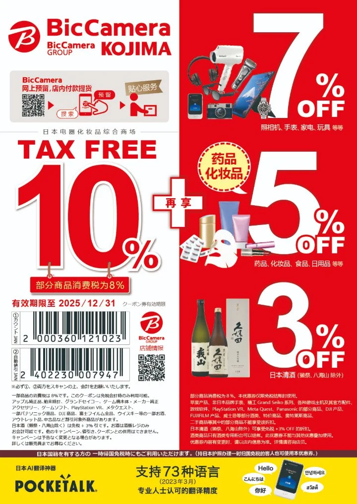 优惠券适用于日本全国多家 BicCamera 分店,以及同集团的 KOJIMA电器 与 Sofmap。结账前出示护照与本优惠券画面,即可享 10%免税 + 3%/5%/7% 折扣优惠。