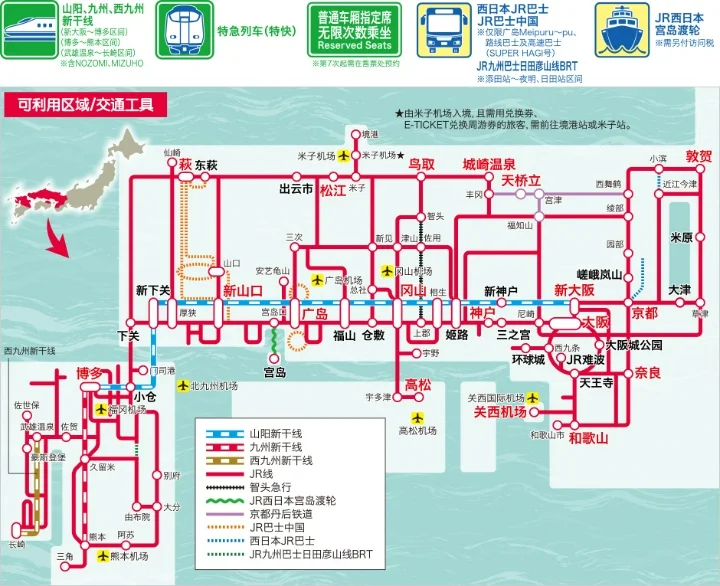 这张交通票券能从关西搭至冈山、广岛、山口、鸟取、岛根等地,九州地区(福冈、佐贺、长崎、熊本、大分)7日内,可以不限次数搭乘!