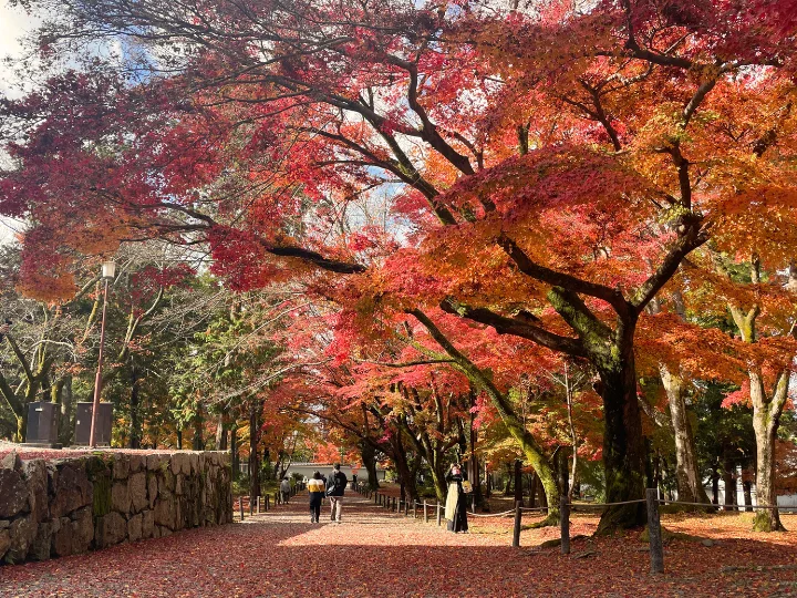这里是冈山县代表性的赏枫景点,秋季会举办红叶祭,并有夜间点灯活动,展现红叶不同面貌。城迹石垣与枫叶交织成壮丽景色,夕阳映照下更添风情。