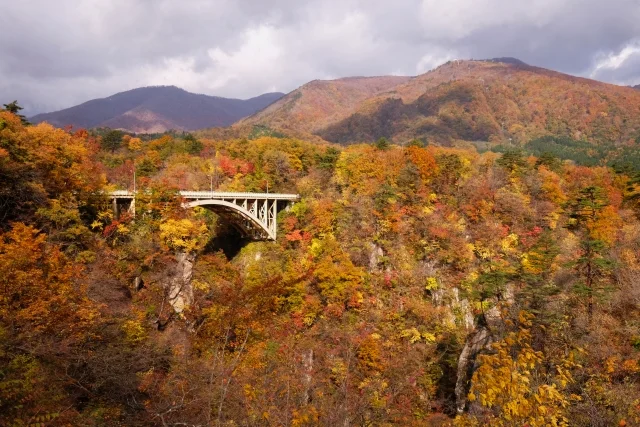 鸣子峡是由大谷川长年侵蚀而形成的壮丽峡谷,以秋季红叶景观为知名。当枫叶染红整片山谷,与穿越其中的铁道相映成趣。可以登上「大深泽桥」,可从高处俯瞰整个峡谷,将层层红叶与溪谷之美尽收眼底。