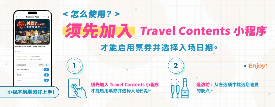 「豪华版乐享周游券」就是这么厉害!让你的日本旅游不再麻烦,轻松一票玩遍多项人气景点与体验~现在就到各大票券贩售平台进行购买,下载「Travel Contents App」开始绑定,开启无忧旅游新体验!