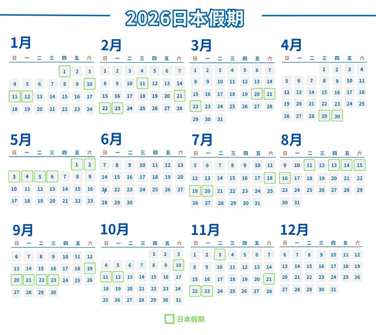 2026 日本国定假日一览表